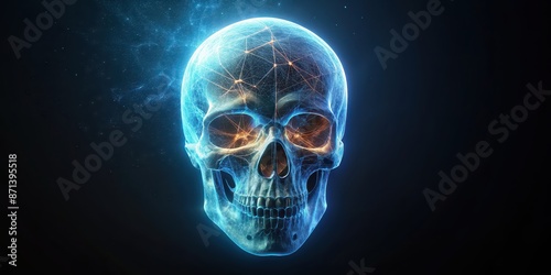 Glowing hologram of human skull bone system structure on dark background, skull, bone, anatomy, medical, science
