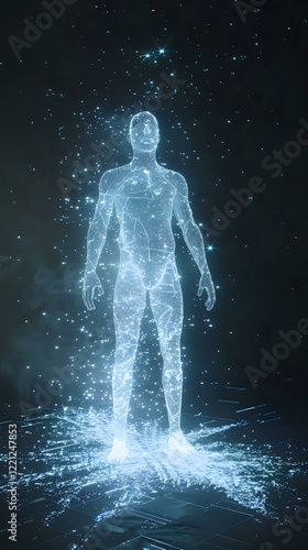 Glowing holographic male figure made of light particles standing on digital surface against dark background. Perfect for technology, artificial intelligence, virtual reality, and futuristic concepts.