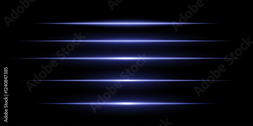 Glowing horizontal blue light set. Bright neon laser lines on a dark background. Futuristic technology, sci-fi elements, digital energy beams, abstract light streaks. Modern cyberpunk high-tech design