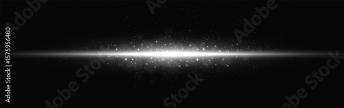 Glowing horizontal light beam with sparkles and dust on black background. White laser with particles for sci-fi effects, magic scene or technology design. Vector Illustration.