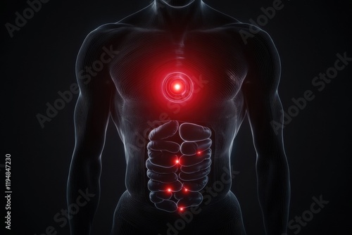Glowing human torso with red focal point in abdominal region illuminated against a dark background. Generative AI