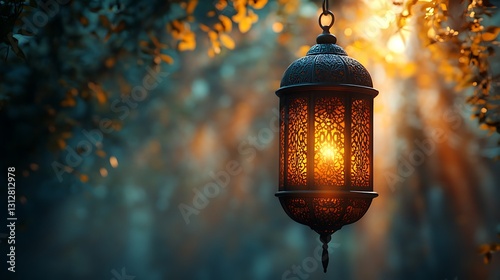 Glowing Intricate Lantern Hanging in a Misty Forest