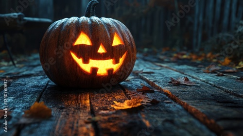 Glowing Jack-o'-lantern on autumn woods deck (1)