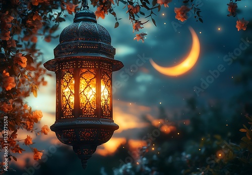 Glowing Lantern Hanging Among Flowers with Crescent Moon Against Twilight Sky