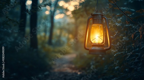Glowing Lantern Illuminating Path in Dense Forest at Dusk