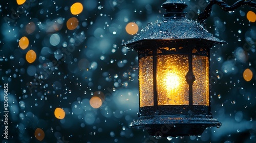 Glowing lantern, snow, bokeh, garden, winter