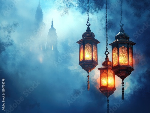 Glowing Lanterns and Misty Castle at Night: A Serene and Mysterious Scene