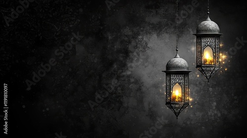 Glowing lanterns, dark background, festive celebration, holiday greeting