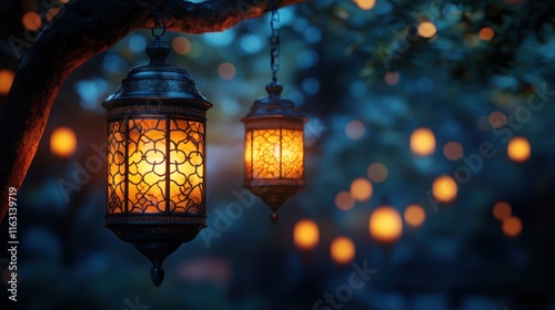 Glowing lanterns hanging in a serene evening setting.