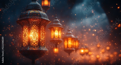 Glowing Lanterns Suspended in Air with Sparks in a Mystical Ambiance
