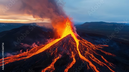 Glowing lava flowing from a volcano at dusk, capturing nature s raw power, volcanic glowtime, intense and dramatic