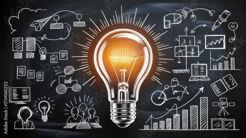 Glowing light bulb innovation creativity idea business strategy planning teamwork success growth inspiring concept with hand drawn sketches on blackboard background
