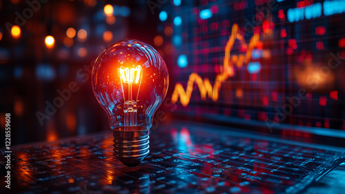 glowing light bulb symbolizes innovation and creativity against backdrop of financial data