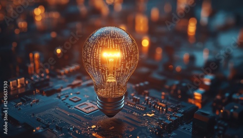 Glowing Light Bulb With Binary Code Inside Floating Above Technology Circuit Board Background