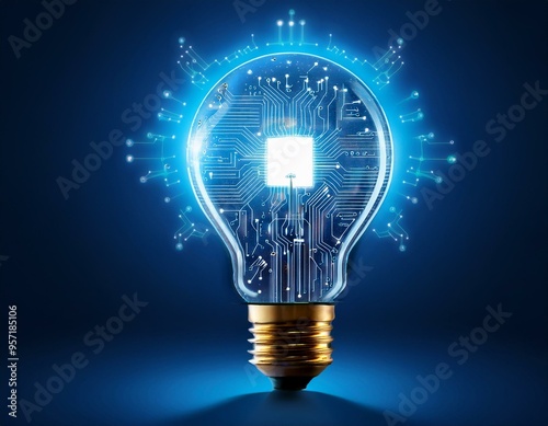 Glowing light bulb with circuit board inside on dark blue background, mockup