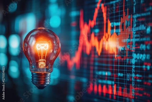 Glowing lightbulb against stock market graph background. Illustrates financial innovation, new ideas, and market solutions.