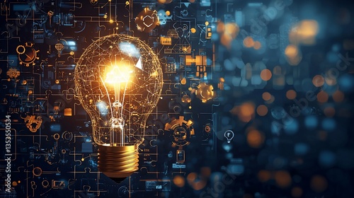 Glowing lightbulb with innovative technology background.