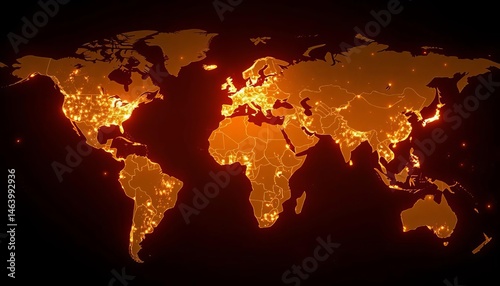 Glowing lines connect major global financial hubs on a world map, illustrating economic activity, investment, connections