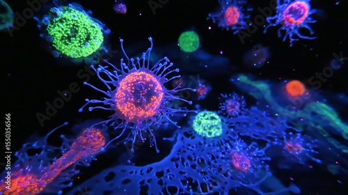Glowing microbial world in dark background with bacteria viruses and fungi floating in neon colored fluid environment