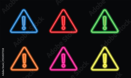 Glowing neon attention sign for design. Warning icon. Attention sign. report icon. Exclamation mark in triangle icon isolated on black background. vector, transparent