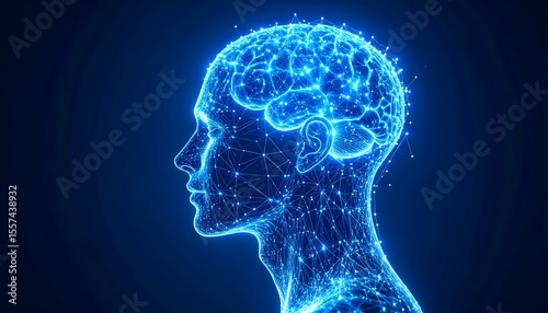 Glowing neon blue neural network forms a detailed human head on a dark futuristic background, showcasing intricate brain-like 3D render.