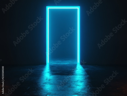 Glowing neon blue rectangular frame doorway in dark room.