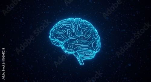 Glowing neon brain outline with an integrated circuit board and "AI" text, symbolizing artificial intelligence on a dark, fragmented background. Future technology concept