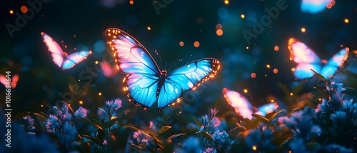Glowing neon butterflies fluttering amidst a dark lush garden setting creating a magical enchanting and whimsical atmosphere This digital evokes a dreamlike
