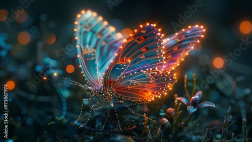 Glowing Neon Butterfly in Enchanted Forest with Bioluminescent Lights and Magical Atmosphere