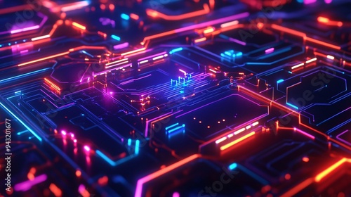Glowing neon circuits with a 3D effect on a futuristic digital background
