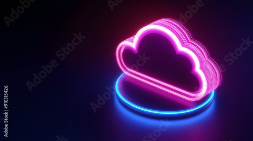 Glowing neon cloud icon on a dark background representing cloud computing technology and modern digital data storage.