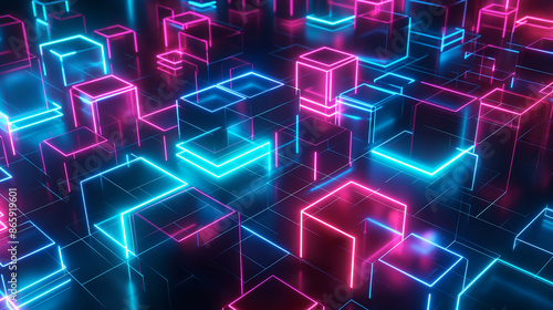 Glowing neon cubes arranged in a dynamic and futuristic pattern.
