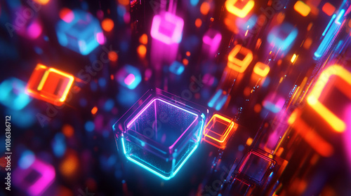Glowing neon cubes in vibrant multicolored digital space suitable for abstract backgrounds, futuristic designs, technology concepts, and creative illustrations. Generated AI