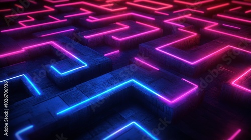 Glowing neon digital pathways forming a maze-like pattern on a dark background.
