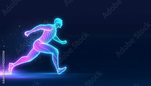 Glowing neon figure of a runner in motion, against dark background