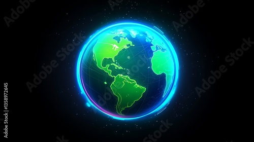 Glowing neon globe icon with green continents and blue oceans on dark background