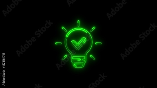 Glowing neon green light bulb with check mark symbolising successful idea concept