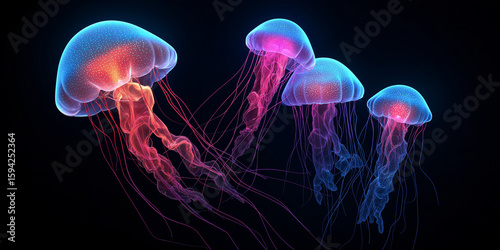 Glowing neon jellyfish float gracefully in dark ocean, their translucent bodies illuminated with vibrant colors. ethereal scene captures beauty and mystery of marine life