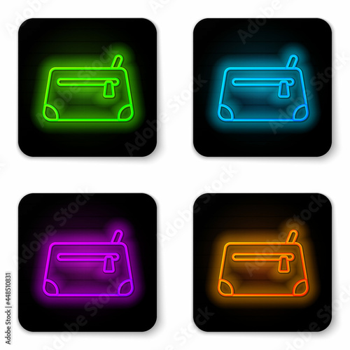 Glowing neon line Cosmetic bag icon isolated on white background. Black square button. Vector