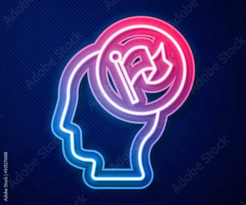 Glowing neon line Hand holding flag icon isolated on blue background. Victory, winning and conquer adversity concept. Vector