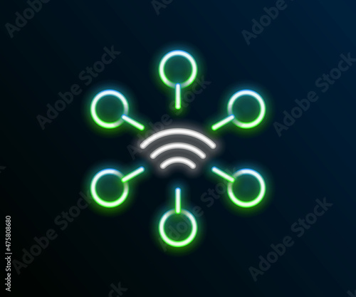 Glowing neon line Network icon isolated on black background. Global network connection. Global technology or social network. Connecting dots and lines. Colorful outline concept. Vector