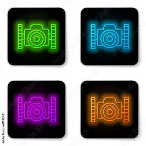 Glowing neon line Photo camera for diver icon isolated on white background. Foto camera icon. Diving underwater equipment. Black square button. Vector