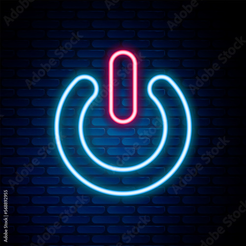 Glowing neon line Power button icon isolated on brick wall background. Start sign. Colorful outline concept. Vector
