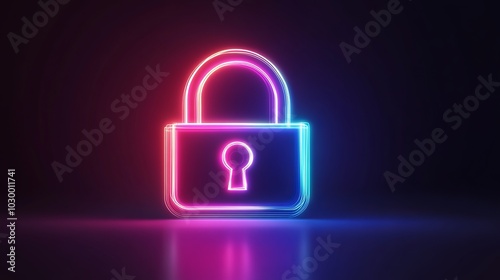 Glowing neon lock icon, vivid padlock outline. Protects personal data, ensures cyber security, and offers reliable storage solutions. Icon set, sign, pictogram.