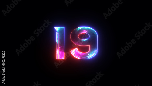 Glowing neon numeric number 19. 4 color neon futuristic effect. Trendy glow lighting.