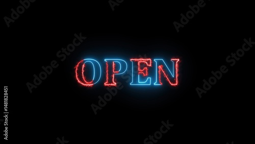 Glowing neon open sign illuminated with red and blue light displaying vibrant text on a black background to attract customers