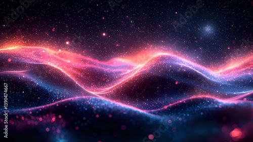 Glowing neon waves flow through starry space, creating dynamic curves of pink and blue light against dark cosmic background with sparkling particles and bokeh effect.