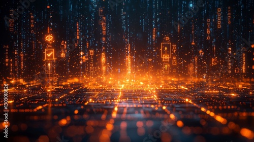 Glowing Orange and Blue Digital Security Icons in Dark Abstract Background