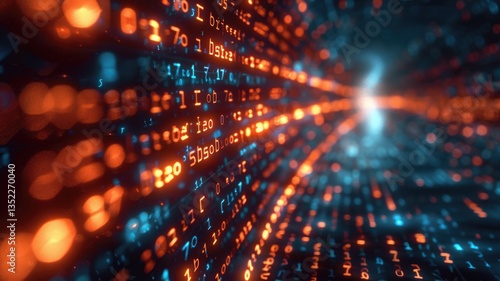 Glowing orange and blue lights in a futuristic digital tunnel. Depth and perspective of neon-lit pathways. Technology and sci-fi concept for wallpaper, banner, and print. Technology innovation. AIG53.