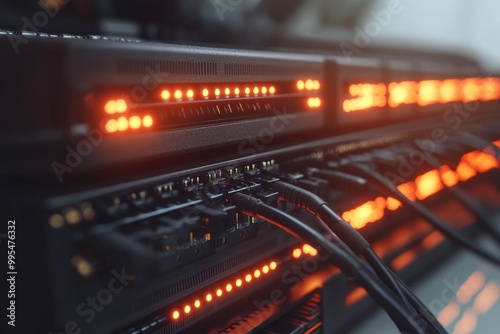 Glowing orange ethernet cables plugged into a server rack symbolizing fast data transmission secure connection and advanced IT systems